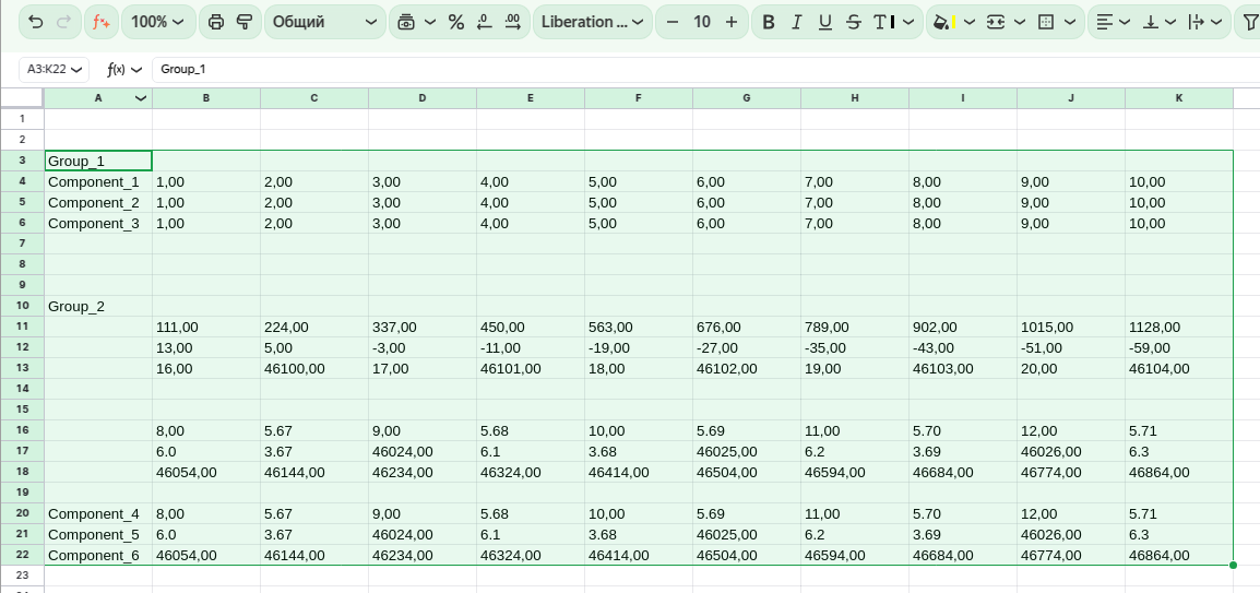 В строку значений группы вносятся только сумма всех её прямых потомков (компонентов и групп). Ручной ввод данных или по формуле в ячейки строки групп запрещён.