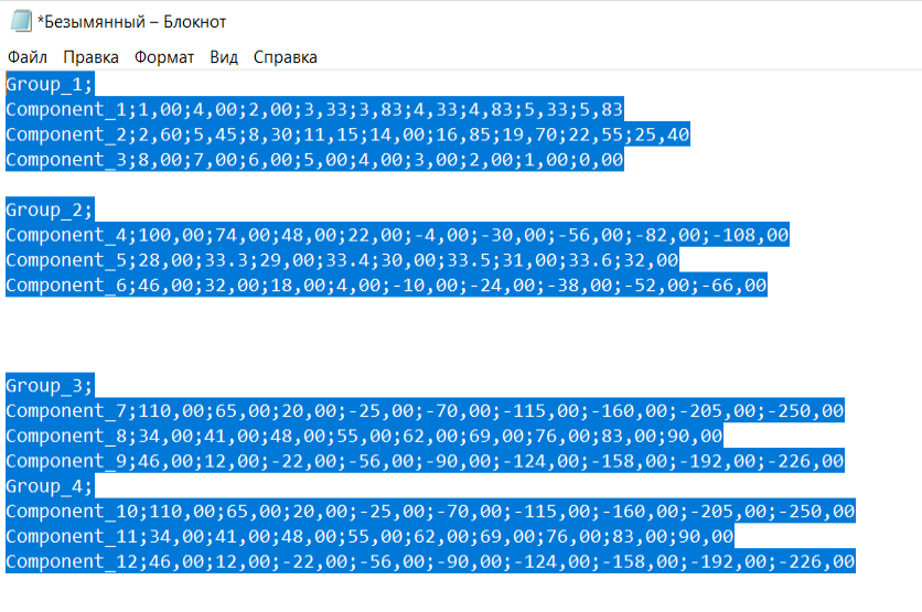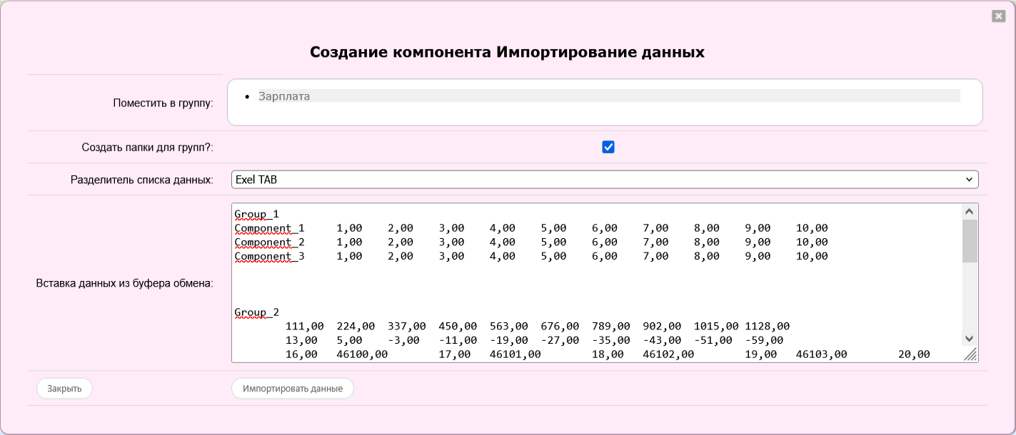 При нажатии кнопки "Импортировать данные", данные из этого поля распарсятся в соответствующие группы и компоненты сохранятся в базе